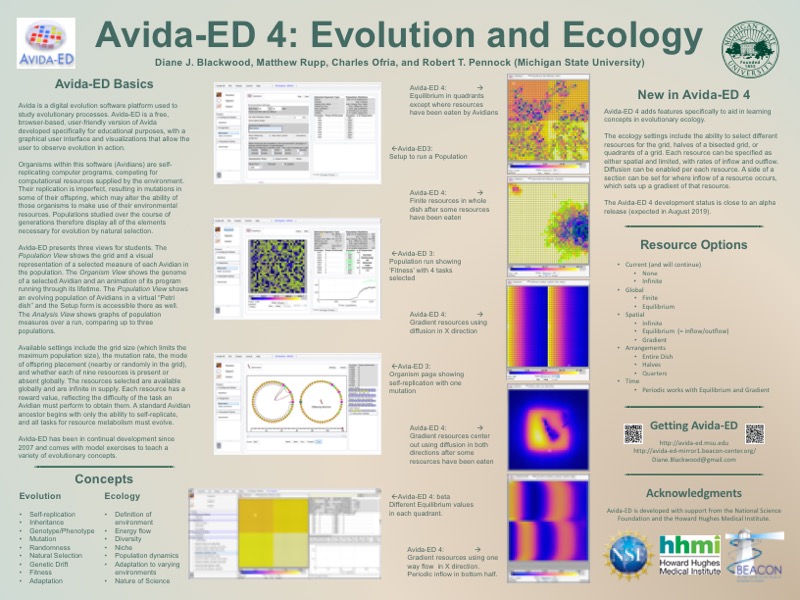 2019 June 24: Diane Blackwood, Matthew Rupp, Charles Ofria, Robert T. Pennock. "Avida-ED 4.0: Ecology" Poster Presentation at Evolution 2019. Providence, RI.